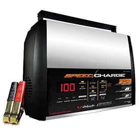 Schumacher SC-1200A SpeedCharge 12/8/2 Amp Charger/Maintainer/Starter/Tester: Automotive. Sturdy, Built-In Handle The built-in, retractable handle serves as convenient cord wrap for the 50-amp clamps and power cord, in addition to providing easy portability. Microprocessor Controlled Microprocessor Controlled Technology with multi-stage charging lets the Schumacher SC-1200A deliver added precision, safety, and battery life. The Schumacher SC-1200A SpeedCharge is a fully automatic battery charger that uses advanced technology to charge up to twice as fast as conventional chargers. It offers 2-, 8-, and 12-amp charging modes to efficiently charge and maintain connected batteries. The 50-amp clamps are compatible with both top and side-mounted battery posts. Its easy-to-read LED indicators show battery charge status at a glance. Quickly charge and maintain conventional automotive batteries, deep-cycle, AGM, and gel cell batteries. Multi-stage, automatic charging for 6V and 12V batteries Multiple Charging Modes Choose from 2-amp, 8-amp, and 12-amp charging modes to quickly charge all types and sizes of batteries. In 12-amp Fast Charge mode, the charger monitors battery condition and adjusts charge rate downward to prevent battery damage for car, truck, marine, RV, and farm equipment batteries. 8-amp Medium Charge is a self-adjusting charge rate that's ideal for everyday charging needs and for keeping your battery in peak condition. 2-amp Slow Charge is a trickle setting for charging and maintaining small batteries, such as those for motorcycles, ATVs, snowmobiles and lawn tractors. Electronic Push Button Controls The SC-1200A features easy-to-feel switches for selection of Charge Rate or Battery Type. Choose between regular, deep-cycle, or AGM battery type, while selecting Fast, Medium, or Slow Charge. This technology lets you charge your motorcycle, car, or utility vehicle batteries up to 2x faster than using conventional chargers. Fully Automatic Operation The SC-1200A automatically switches from Continuous Charge to Float-Mode Monitoring, which allows the charger to maintain the battery when fully charged.
