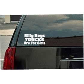 Silly Boys Trucks Are For Girls Vinyl Decal - White Window Sticker: Automotive. This sticker has white letters. This vinyl sticker is 8 inches wide and contour cut from premium vinyl. This is a decal that can be applied to just about any smooth surface. This decal are made from the highest quality vinyl to give you many years of use without fading or peeling.