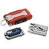 Swiss+Tech 61011 Gift Box Set of Micro Mini Tools: Automotive. Constructed of stainless steel, with no plastic parts, this mini multi-tool is very durable. Swiss+Tech represents a quantum leap in the art of micro-tool making. They're compact, easily transportable tools that combine craftsmanship and innovation to create a new category of patented consumer products--Key Ring Tools. Unlike all other multi-function tools, many Swiss+Tech tools have a patented, quick-release, integrated locking system that attaches to any key ring, thereby eliminating the need for an additional ring or belt holster. These innovative, high-quality, light-weight products fulfill a common need--having the tools you need when you need them. They make a great gift. What's in the Box? LED Pocket Flashlight Compact convenience packed into a slim-line, bright white flashlight. Effortless pushbutton control operates with click-action ease Precision-crafted, high grade aluminum construction Replaceable AAA battery included Use lanyard on wrist or to hang flashlight for working and easy-to-locate storage Mini Multi Tool 8-in-1 This compact multi-tool is small enough to fit on a key ring and offers 8 different useful tools. Batteries and a bonus nylon belt pouch are included. Needle Nose Pliers Wire Cutter Can Opener Phillips Screwdriver Straight Edge Knife Serrated Knife LED Flashlight Key Ring Micro-Max 19-in-1 This solid stainless steel tool set, with its patented, quick-release mechanism, folds out into 19 different professional-grade tools.