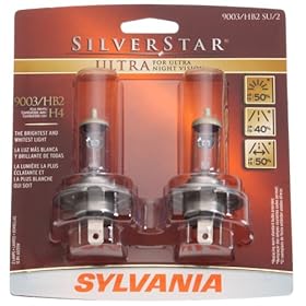 Sylvania 9003/HB2 SU/2 BP TWIN SilverStar Ultra Headlight - Pack of 2: Automotive. This operates with internal gas pressure which significantly reduces the rate of tungsten evaporation. Sylvania's SilverStar Ultra product line of halogen headlight bulbs are the ultimate choice for professionals and do-it-yourselfers who want and/or need to provide the whitest and brightest automotive lighting option possible to vehicles that they are servicing. The SilverStar Ultra 9003HB2/SU BP twin-pack contains two high performance halogen headlight bulbs which feature dramatic improvements over standard halogen bulbs, including up to 50% brighter light, 40% increased down-road visibility and up to 50% increased side-road visibility. .caption { font-family: Verdana, Helvetica neue, Arial, serif; font-size: 10px; font-weight: bold; font-style: italic; } ul.indent { list-style: inside disc; text-indent: -15px; } table.callout { font-family: verdana; font-size: 11px; line-height: 1. 3em; } td.vgoverview { height: 125px; background: #9DC4D8 url(http://images.amazon.com/images/G/01/electronics/detail-page/callout-bg.png) repeat-x; border-left: 1px solid #999999; border-right: 1px solid #999999; padding-left: 20px; padding-right: 20px; padding-bottom: 10px; width: 250px; font-family: verdana; font-size: 12px; } The whitest, brightest headlight available. View larger. See farther, wider and more clearly. View larger. Why You Should Upgrade to SilverStar Ultra It is an accepted fact that headlights can dim over time by 20% or more. When this dimming occurs, timely replacement of halogen bulbs can instantly increase lighting performance and resulting visibility, but all halogen bulbs are not created equal. The more light you can spread on the road, the better the visib[7043] Sylvania SilverStar Ultra Headlight is fashioned for brighter and whiter light. It has dual filament for both high beam and low beam. Its analogous non-halogen incandescent lamp operates the same filament temperature with greater luminance and efficiency.