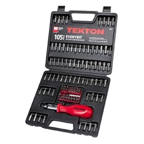 TEKTON 2840 Everybit Ratchet Screwdriver and Bit Set, 105-Piece: Home Improvement. Every Bit for Any Project, Twelve Bit Types, Each in a Full Range of Sizes, Screwdriver Bits:, Chrome Vanadium, Chrome Molybdenum and S2 Steel Construction, Corrosion-Resistant Sandblasted Finish, Use Bits with any Power Driver, Ratchet Screwdriver:, 3-Function Ratchet Screwdriver: Forward, Fixed, and Reverse Drive.