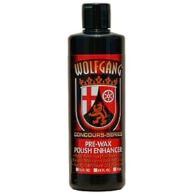 Wolfgang Polish Enhancer: Automotive. Allow a slight haze to form. Directions:1. Pour a nickel-size amount of Wolfgang Paintwork Polish Enhancer onto a clean terry or microfiber applicator pad. This should be enough to cover half of the hood or an entire fender. Spread the polish across the section in an overlapping motion. 2. Allow a slight haze to form. Use a clean terry cloth or microfiber towel to buff the surface to a bright shine. 16 oz.Wolfgang Paintwork Polish Enhancer is your last chance to create a memorable gloss before wax application. Wolfgang's pre-wax cleanser removes old waxes and sealants, light oxidation, and paint contamination to reveal deep color and gloss. One you apply a wax or paint sealant, it will enhance the smooth, clean paint created by Wolfgang Paintwork Polish Enhancer. If you want the ultimate gloss, it starts with Wolfgang Paintwork Polish Enhancer!Tech notes: To maximize the effectiveness of Wolfgang Paintwork Polish Enhancer, apply out of direct sunlight onto a freshly washed, cool, dry surface. The polish may be applied by hand or buffer, to equal satisfaction. Always follow up the polish application with Wolfgang's Deep Gloss Paint Sealant or Wolfgang Fuzion Estate Wax. Both products will create a dramatic gloss on all colors and types of paint.Directions:1. Pour a nickel-size amount of Wolfgang Paintwork Polish Enhancer onto a clean terry or microfiber applicator pad. This should be enough to cover half of the hood or an entire fender. Spread the polish across the section in an overlapping motion. 2. Use a clean terry cloth or microfiber towel to buff the surface to a bright shine.