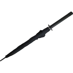 Samurai Sword Umbrella: Everything Else. Glide your Samurai Umbrella out of its sheath and save the world/ your coat from impending doom/ getting wet by Ming the Merciless/ rain. With a Samurai sword handle, you will be begging for rain with our awesome Samurai Umbrella! Unlike ordinary umbrella's, this one kicks ass as you strut down the street with it strapped to your back, ready to whip it out at the very site of a grey cloud. Use your cunning and stealth-like Ninja instincts to detect moisture in the air. This large black umbrella is fantastically manly and can be carried around in honour and pride as you hop gayley from puddle to puddle.