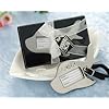 Airplane Luggage Tag in Gift Box with suitcase tag - Set of 50: Home & Kitchen. Attached is a black adjustable leather strap. Have your boarding pass ready and grab your carry-on! Travel buffs and frequent fliers alike will adore the utility of this special little favor. What a great way to thank your guests for traveling to your event. Each airplane shaped tag is forged from heavy weight chrome and adorned with three heart shaped passenger windows. These luggage tags could easily double as place card holders. Each luggage tag comes packaged in a black bottom gift box with sheer organza ribbon and retro luggage thank you tag.