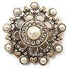 Antique Gold Filigree Ivory Pearl Corsage Brooch: Jewelry. Featuring a filigree oval shaped design, crafted in antique gold finish and decorated with ivory faux pearls and clear crystals for a dazzling style. Unmatched elegance. You'll stand out wearing this sparkling Antique Gold Filigree Ivory Pearl Corsage Brooch. The brooch measures around 60mm x 65mm and secures with a flag and revolver fastener.