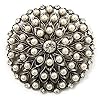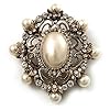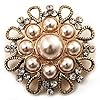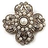 Antique Gold Filigree Pearl Corsage Brooch: Jewelry. Featuring a filigree snowflake design, crafted in antique gold finish and decorated with white faux pearls and clear crystals for a dazzling style. Unmatched elegance. You'll stand out wearing this sparkling Antique Gold Filigree Pearl Corsage Brooch. The brooch measures around 47mm in diameter and secures with a flag and revolver fastener.