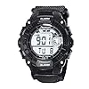 Armitron Mens 408209BLK Chronograph Black Digital Sport Watch: Watches. The comfortable, black, resin strap is designed with printed shock inch graphics and securely fastens with a buckle clasp. The Armitron Men's Chronograph Black Digital Sport Watch includes all the features needed for a casual sport watch and has a high tech look that will still complement daily wear and most casual styles. The round, black, resin case and bezel feature a polished black top ring. The gunmetal-grey, digital dial displays the time across the center in Arabic numerals with the seconds displayed in a white window at the right of the display. The day and date are easy to read at the bottom center of the dial. Other functions of this watch include chronograph functions, alarm, lap timer, dual time, and military time. This timepiece offers reliable Japanese quartz movement and is protected by a durable mineral crystal.