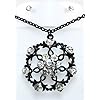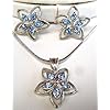 Clear Austrian Crystal Solitaire Flower Necklace And Earrings Set: Jewelry. Six (6) small crystalssurround one (1) medium sized crystal on the hanging flower design andanother (1) large crystal rests on a Solitare pendant, with a striateddisc surrounded by a full crescent. A total of eight (10) shimmering Clear Austrian Crystalsembellish this beautiful necklace earring set.