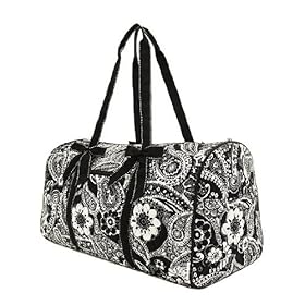 Belvah large Quilted flower & Paisley 21 inch Duffle Bag (Balck/white): Sports & Outdoors. This duffle bag also can make a great gift for your friends and family. This duffle bag is very cute, trendy and functional. It is a large sized duffle bag. It measures 21x12x11. It features 2 slip in pockets and one zippered pocket inside. It also has a front zippered pocket. It comes with four detachable ribbons. You can take them off if they are too much for you. The bag still looks very nice. This duffle bag can be used as a travel bag, gym bag, carry-on, overnighter, book bag for college, beach bag and shopping bag etc. She will be delighted to receive this fashionable duffle bag.