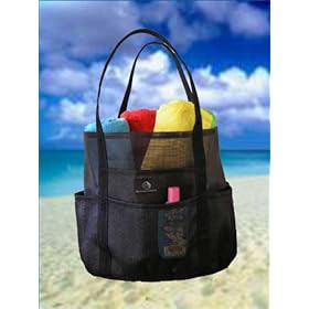 Black Mesh Beach Tote - Family Size Whale Bag: Sports & Outdoors. The mesh lets you see it all. The Whale Bag is our best-selling family bag. Perfect for an easy day at the beach, vacation, for scuba and snorkeling, camping trips, coaching, a last minute picnic, storage, college laundry . . . and more. This fully waterproof mesh bag stands up by itself, & squashes for easy storage. It will stand upright in the car, and the doubled polypropylene straps go from top to bottom to hold any load. The Whale Bag holds up to 6 beach towels, with room for toys, sunscreen, or your juicy novel in all the pockets. The oval shape is about 15 inches across, and 15 inches tall. 8 puffed out pockets hold everything you need. Organized at last! An inside snap hook holds keys or sunglasses safely.
