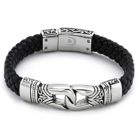 Braided Black Leather Mens Bracelet Stainless Seel: Jewelry. Instead of a traditional metal band, this mens bracelet features rich black leather which is braided tightly to form a distinct pattern. Inspired by indigenous Aztec and Native American art, this bracelet?s carved pattern, etched in stainless steel, has dark contrast so it resembles oxidized sterling silver.