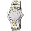 Bulova Mens 98D114 Diamond Dial Watch: Bulova: Watches. A stainless steel case and fixed gold-tone bezel surround the round analog dial and sturdy mineral crystal window. Ideal with more formal attire or as a special gift, the Bulova Men's Diamond Dial Watch features a striking two-toned design. Gold-toned hands and markings are elegant contrasts to the quartet of diamonds at the 12, three, six, and nine o'clock positions. Smooth two-toned links and fold-over safety clasp compose the band of this clean and refined timepiece.