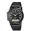 Casio Mens AW80V-1BV World Time Ana-Digi Data Bank 10-Year-Battery Watch: Casio: Watches. The watch's world time feature ensures that you'll never have to guess the time difference between your location and home. The Time Data Bank from Casio is an ideal watch for any traveler. Its analog and digital display allows the wearer to check the time in up to two time zones at once. Constructed with an all-black design, including a stainless steel case, stainless steel bezel, and a nylon band, this men's timepiece features a black round dial with blue Arabic-numeral hour markers and a digital display with both a 30-page databank capability and a day, date, and month calendar.