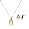 Cream Simulated Pearl and Crystal Earring and Necklace Set, 18: Jewelry. This elegant necklace is matched by a pair of round white pearl studs that are accented with clear crystals. Showcase your classic and feminine style with the Cream Simulated Pearl and Crystal Earring and Necklace Set. Sitting at the bottom of an ornate Singapore chain is a simple round white pearl pendant. The studs will stay securely in place by bullet-clutch-with-disk backings.