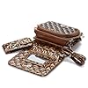 Croc Embossed Compact Cell Phone/Wallet: Clothing. The front has a pocket that can fit small accessories or compact cell phones. This beautiful luxe faux croc-embossed wallet is great for everyday use. It comes with an attached wrislet. This wallet features a faux croc-embossed material all around the exterior and has metal studs on the front. The interior has a bill slot, 4 card slots, a transparent ID slot on the back exterior and a zipped compartment for coins. The dimensions are 3 inch X 2 inch X 5.5.