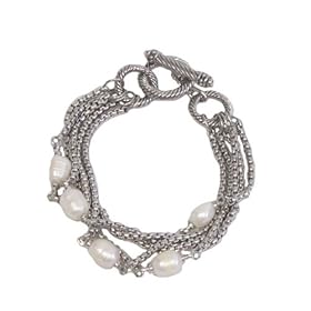 Designer Inspired Multi Chain Pearl Toggle Bracelet: Jewelry. Constructed of sterling silver and brass and plated in rhodium, this bracelet is resistant to tarnishing making it maintenance free for you. This darling designer inspired bracelet is a classic style accessory that is sure to make a long lasting impression. If you like Designer jewelry without the high price, then this is the piece of jewelry for you. This cable design can be seen in the details of the rings and the toggle clasp on this fashion bracelet. This particular silver bracelet features five thick box chains that are strung with five stationary faux pearl beads. The five strands of chain come together with a toggle clasp. This designer inspired bracelet looks great when paired with a casual outfit or wear it to spice up your evening attire. Either way you choose to wear it, you will be happy to show it off. This designer inspired bracelet measures 7.5 inches in length.