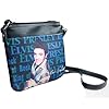 Elvis Faux Leather Cross-Body Bag: Shoes. The inside is lined with fabric and has a zipped pocket and another pocket for smaller items. This bag is for all of you Elvis lovers! It is made out of faux leather and has Elvis Presley printed on the front. It has a magnetic snap closure, and under the front flap there are wallet features. The dimensions are 8 inch X 1.75 inch X 7 inch with an adjustable strap.