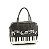 Elvis Faux Leather Piano Bag with Rhinestones: Clothing. The inside is lined with fabric and has a zipped pocket, and two additional pockets for smaller items. This Elvis bag is super fun! It has a picture of Elvis performing and a piano printed on the front of the bag. There is a row of rhinestones and studs going across the top and bottom. This bag has a top zip closure to secure your belongings. The dimensions are 13.5 inch X 6 inch x 10.5 inch with an 8 inch shoulder drop.
