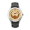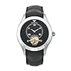 Emporio Armani Mens AR4640 Meccanico Black Leather Band Watch: Emporio Armani: Watches. The dial is protected by a mineral crystal and features silver-toned index hour markers and silver-toned hands powered by automatic self-wind movement. A bold and revealing timepiece with loads of class, the Emporio Armani Men's Meccanico Black Leather Band Watch is a mechanical wonder. This dashing watch begins with a round 44mm stainless steel case with a fixed steel bezel and a textured crown. These elements surround a striated black dial with mini skeleton window at 6 o'clock, brushed silver-tone skeleton detailing and polished silver-tone logo applique above 12 o'clock. A black leather band straps this watch to the wrist, while a silver-toned buckle clasp ensures its secure placement.