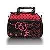 Hello Kitty Overnight Bag: Black & White Dot: Clothing. This zipper closure overnight bag features Hello Kitty among outlines of her posing cutely with her favorite items with a contrast of white dots over a black background for a new look. Store your overnight items in this adorable Hello Kitty Overnight Bag in Black and White Dot design. Hello Kitty's traditional bow in red is printed all over the interior lining for an extra touch of cuteness.