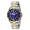 Invicta Mens 9938 Pro Diver Collection Automatic Diver 23k Gold Plated Watch: Invicta: Watches. Lastly, automatic movements come in different types, including movements that are Swiss-made, Japanese-made, and more.Also referred to as self-winding, watches with automatic movements utilize kinetic energy, the swinging of your arm, to provide energy to an oscillating rotor to keep the watch ticking. You can be a serious diver and still show a bit of style with the two-tone Invicta Diver stainless steel men's watch (model 9938) with 23 karat gold-plated highlights. The round, silver watch case measures 42mm (1.65 inches) wide has a blue unidirectional rotating bezel with gold markings and gold coined edge highlights. The blue dial background is accented by large luminous Tritnite hands (with seconds hand) and dotted dial markers. The stainless steel bracelet band mixes polished gold-tone and brushed silver links. Other features include a scratch-resistant mineral crystal, water resistance to 200 meters, and a date function at 3 o'clock.Screw Down Crowns: Many Invicta watches are equipped with a screw down crown to help prevent water infiltration. This is most common on our Diver models. In order to adjust the date and/or time on such a watch, you must first unscrew the crown before you can gently pull it out to its first or second click stop position. To do this, simply rotate the crown counterclockwise until it springs open. When you have finished setting the watch, the crown must then be pushed in and screwed back in tightly. Not doing so will cancel the water resistance of the watch and will void all warranties from the manufacturer. Overall, this process should not require a lot of effort or force.Automatic WatchesAutomatic watches do not operate on batteries. Automatic watches are made up of about 130 or more parts that work together to tell time. Automatic movements mark the passage of time by a series of gear mechanisms, and are wound by the movement of your wrist as you wear it. The gear train then transmits the power to the escapement, which distributes the impulses, turning the balance wheel. The balance wheel is the time regulating organ of a mechanical watch, which vibrates on a spiral hairspring. Lengthening or shortening the balance spring makes the balance wheel go faster or slower to advance or retard the watch. The travel of the balance wheel from one extreme to the other and back again is called oscillation. They're considered more satisfying to watch collectors (horologists) because of the engineering artistry that goes into the hundreds of parts that make up the movement.