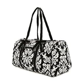 Large Quilted Damask Print Duffle Bag - Black/White: Everything Else. This duffle bag can be used for a travel, sports, beach, college campus and shopping etc. This duffle bag is trendy and functional. It is a large sized duffle bag. It measures 21x12x11. It features 2 slip in pockets and one zippered pocket inside. It also has a front zippered pocket. It comes with four detachable ribbons. This duffle bag also can make a great gift for your friends and family.