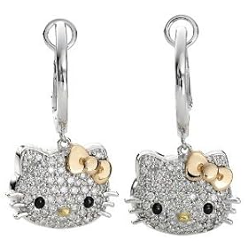 Loveable Silver Plated Hello Kitty CZ Hoop Earrings with 14K Gold Bow: Jewelry. Black Czs form the eyes. Celebrate your lifestyle with these absolutely lovable shimmering silver plated Hello Kitty hoop earrings. These sparkly earrings are custom made and complemented with a great assortment of CZ Diamonds. Miss Kitty's trademark bow is 14K gold plated and adds a flash of color.