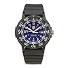 Luminox Mens 3053 EVO Navy SEAL Colormark Watch: Luminox: Watches. Vibrant blue Arabic numerals contrast with the classic black dial, while smaller blue numerals mark the 24-hour clock. Perfect for low-light or no-light situations, the Luminox Men's Navy SEAL Colormark watch glows 100 times brighter than other luminous watches, which allows for easier visibility. This timepiece This versatile timepiece is constructed with a 48-millimeter polyurethane case and matching durable polyurethane band, which includes a buckle clasp with safety mechanism. In addition, a handy date calendar rests at the three o'clock position, and the unidirectional, textured, polyurethane bezel features striking blue minute indexes for easy readability.
