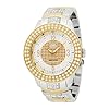Marc Ecko Mens E22581G1 King Watch Box Set: Marc Ecko: Watches. A durable mineral window shields the textured silver-and-gold dial, which features a silver-tone hour markers with Arabic numerals at three, six, nine, and 12 o'clock. The flashy Marc Ecko Men's King Watch Box Set showcases hip gold-tone construction and sparkling Swarovski crystal accents. This formal timepiece is designed with a stainless steel case, a gold-tone-stainless-steel bezel with glittering crystal embellishments, and a gold-tone-stainless-steel link bracelet secured with a deployment buckle. The dial also includes slim black minute markers with Arabic numerals at five-minute increments.
