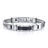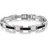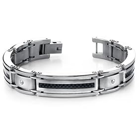 Masculine Mens Heavy Steel Bracelet with Rivet highlights: Peora: Jewelry. This design also makes use of both high polish stainless steel and brushed finish steel as well. This mens bracelet is made out the hottest material to hit the jewelry industry in ages: stainless steel. Who knew that this metal would be all the rage in mens and womens jewelry? When you think about it, its perfect. It stays free of rust, wears well and matches just about anything. It is the perfect metal to make mens jewelry out of, as you can see when you look at this bracelet. This mens bracelet has alternating short and long links with accents of black carbon fiber and rivets. It weights a substantial yet comfortable 80 grams, is 8 inches long and is 1/2 inch wide. This mens bracelet even has a fold over clasp that ensures the bracelet will never fall off.