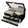 Mele & Co. Alana Glass Top Black Croco Locking Jewelry Box: Home & Kitchen. The lid is clear glass for viewing, and the top compartment features three sections with padded watch cushions, six equally divided sections, and ring rolls. Convenient and stylish, this glass top locking jewelry box is finished in Black Croco faux leather. One open section contains a take-away travel case with hinged earring card divider, one open section, ring rolls, ivory sueded fabric lining, and a snap closure.