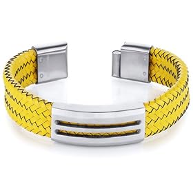 Mens Modern Yellow Woven Leather and Stainless Steel Bracelet: peora: Jewelry. Measures 8.4 inches in length and 3/4 inch in width. Update your wardrobe with a comfortable, durable bracelet featuring a bright yellow colored flat woven leather strap accentuated by a Brushed Stainless Steel Center piece. We suggest pairing it with your favorite t-shirt and jeans. Its effortlessly cool and casual design makes it perfect for everyday wear. In addition to the genuine leather band, this original piece also features a patented magnetic keyhole clasp made of stainless steel to ensure a secure and sophisticated fit. Includes a Designer Gift Box.