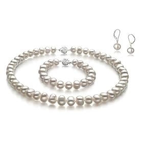 PearlsOnly Kaitlyn White 8-9mm A Freshwater Pearl Set: PearlsOnly: Jewelry. This set is carefully hand strung on a versatile and flexible jewelers wire. This gorgeous white set is created from genuine high quality freshwater pearls. Carefully grown over many years, they have been gently harvested and matched to the strictest of standards.This set is part of hand selected selection of gorgeous freshwater white cultured pearls. You will love wearing this substantial 8 to 9mm size - a perfect size for those times when you need to impress.This beautiful A quality set features very nice AA luster, naturally beautiful off round A shape and Baroque body.This set consists of a beautiful 8 to 9mm white pearl necklace, accompanied by a matching pearl bracelet and a pair of sterling silver lever back post mounted pearl earrings. Purchasing a complete ensures that all your pearls will be perfectly matched.