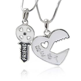 White Silver tone Best Friend Two Pendants Necklace Fashion Jewelry -- 2 Necklaces: Jewelry. Chain 18 inch long. Here is the perfect 2 pc necklace for best friends. 2 necklaces, one for each friend! This silver tone epoxy necklace has two pendants: one is a heart, the other is a key. Pendant approximately 1½. This necklace is great for gift giving.
