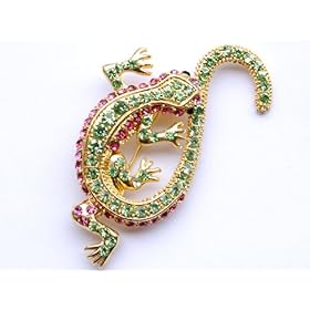 Peridot Fuchsia Pink Crystal Rhinestone Golden Lizard Gecko Reptile Pin Brooch: Jewelry. Stunning gecko pin brooch, golden tone plated metal based, adorned with peridot green and fuchsia red crystal rhinestones.