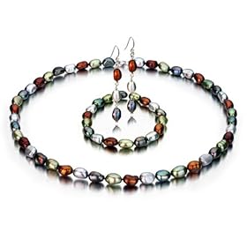 Baroque Multi Color Grey, Black, Pistachio, and Chocolate Freshwater Cultured Pearl Set, Sterling Silver Lobster Clasp, 7-8mm AA Quality Pearls, 18 Inch Necklace, 7 Inch Bracelet: Jewelry.