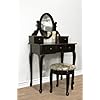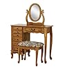 Powell Heirloom Cherry Jewelry Armoire Vanity: Home & Kitchen. The bench measures 18-1/2 inches wide by 14-1/2 inches deep by 17-1/2 inches high. Traditional furnishing and modern storage blend seamlessly together with Powell's Heirloom Cherry jewelry armoire vanity set. Crafted of deep cherry veneer with slender, carved legs and delicately scalloped skirts, this graceful assembly looks as if it has been in the family for generations. Sit at the vanity to apply makeup or add jewelry to the day's outfit, and experience the luxury of a bit of pampering time. Plus, it's wonderful to know that valuables are safely protected from damage and loss--even in the busiest of living spaces. The set's dressing table offers efficient organization, beginning with six divided drawers stacked vertically down the left side. Use the four smaller drawers for items like rings, broaches, and watches, and fill the two large drawers with scarves and special lingerie. Each drawer opens with a sculpted gold knob and is luxuriously lined with black rayon. Another drawer with a hinged pull sits to the right and offers an easy-to-clean vinyl interior for cosmetics. On top of the armoire, the large oval mirror perches on a shapely stand and tilts up and down. For necklaces and chains, open the side pocket door to access a row of sturdy metal hooks. The accompanying bench seat features a softly hued floral print cushion for a romantic finish. The vanity measures 36 inches wide by 16 inches deep by 51 inches high. Some assembly is required.