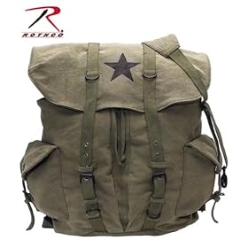 Rothco 9158 OLIVE DRAB VINTAGE STAR BACKPACK: Sports & Outdoors. WASHED OUT OLIVE DRAB CANVAS W/BLACK STAR on FRONT FLAP 2 FRONT INSIDE POCKETS WITH DRAWSTRING CLOSURE INNER ZIPPER POUCH 2 SIDE POCKETS WITH FLAPS FRONT AND SIDE POCKET STRAP CLOSURES W/METAL BUCKLES ADJUSTABLE SHOULDER STRAPS 18 inch X 15.