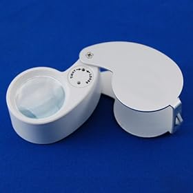 SE 30X Illuminated Jewelers Loupe: Jewelry. Runs on (3) button-cell batteries, included, and has a tiny wrench to help you replace them. Mighty Bright Loupe This 8X folding loupe in white plastic and aluminum has a pair of very bright white LEDs next to the lens.