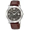 Seiko Mens SGEE97 Strap Blue Dial Watch: Seiko: Watches. The timepiece is constructed with a stainless steel bezel. The Seiko men's dress watch has a brushed and polished stainless steel case and black leather strap which creates an elegant finish. A durable crystal protects the blue dial, which features silver-tone hour markers with a Roman numeral at the 12, 6 and 9 o'clock positions as well as a date calendar.