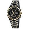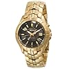 Seiko Mens SNA414 Flight Alarm Chronograph Watch: Seiko: Watches. The watch is presented on a gold-toned stainless steel link bracelet that fastens with a fold-over-push-button-clasp-with-safety. This black and gold flight chronograph watch has handsome styling and a stunning array of features. It has a round black dial, with luminous markers and large luminous hands, set in a gold-toned stainless steel bezel with coin-edge detail. The watch features a date window at the three o’clock position and three sub-dials. The chronograph offers precise stopwatch timing, measuring up to 60 minutes in 1/5-second increments. The alarm sub-dial has two small hands and can be set on a 12-hour basis. It doubles as an international travel clock since the alarm hands can be set to indicate the time in a different time zone. This watch also has a bi-directional rotating slide rule bezel for performing many types of calculations. Other features include a scratch-resistant curved Hardlex crystal and a screw-down crown and caseback. Water-tested to 200 meters, the watch is suitable for skin diving.