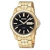 Seiko Mens SNK314K Seiko 5 Automatic Gold Dial Gold-Tone Stainless Steel Watch: Seiko: Watches. The dial also sports a date window at the three o'clock position, and the entire dial is protected by a mineral crystal. The Seiko Men's 5 Automatic Black Dial Gold-Toned Stainless Steel Watch boasts high-tech Japanese automatic movement hidden behind classic analog styling. Precise 21-jewel Japanese automatic movement keeps this watch functioning without a battery: It is powered automatically with the movement of your arm. This high-tech feature is tucked away behind the watch's black dial, which boasts luminous gold-toned hands and baton hour markers. Keeping all of this securely on your wrist is a polished gold-toned two-toned stainless steel link bracelet that closes with a fold-over double push-button safety clasp.