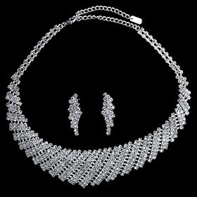 Silver Tone Rhinestone Crystal Bridal Necklace Earrings 2-pcs Set: Jewelry. Earrings measure 1.5 inch tall. This choker design jewelry set comes with matching necklace and earrings. Set in silver tone metal alloy and dazzled with rhinestone crystal. Necklace measures 15 inch with 4 inch extension. A beautiful matching jewelry set gift for wedding party and bridesmaid gift.