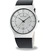 Skagen Mens 233XXLSL Brown Leather Watch: Skagen: Watches. Moisture could seep past the seals over time. To clean the band or strap: Skagen soft mesh bands are easily adjustable. The History of Skagen Designs In 1987, Henrik and Charlotte Jorst came to the United States from their native Denmark to follow a dream: that of owning and running their own business. Skagen Designs was founded by these two natives of Copenhagen on the principle that beautifully designed, high-quality objects can be created at reasonable prices. The Skagen Collection of watches reflects the Jorsts' creative Danish spirit with clean, elegant designs, skillful craftsmanship and technical perfection. When you purchase a piece from the Skagen Collection, you become part of an international community of Skagen owners who believe in a philosophy of design and manufacturing excellence. Skagen Trend Spotting In the market place, time never stands still and so our innovation never sits idle. Our design team is on the pulse of current fashions, with regular visits to design centers of the world including Denmark, Switzerland,Italy, France, New York and Hong Kong. We are never content to follow established trends. We stay true to our classic design philosophy and interpret trends accordingly. We observe, listen and innovate - all to create lasting design pieces. The Result The production of such lasting design pieces often demands special processes and tooling. These are often a challenge to create; however, we are never satisfied with close enough. We continually push and fine-tune designs to stay true to our standards. We know what we want and are not satisfied until the design, material and workmanship are all just right. The result of such hard work and dedication speak for themselves in the jaw dropping enthusiasm and excitement created whenever anyone views our product line. Maintaining Your Skagen Watch Ensure that the crown is returned to the normal operating position before the watch comes in contact with water. Do not take your watch into a Hot Tub or Sauna. Under normal conditions, the seals in your Skagen watch will deteriorate and may need to be replaced every 2-3 years. Have your Skagen watch serviced by an official service center. All Skagen watches operate with standard batteries. When necessary, any jeweler can replace them for you. Different models are water resistant to varying degrees. Please refer to the back of your watch for the water resistant rating. How To Set The Time And Date Pull the crown out to the middle position. Rotate the crown to set date Pull the crown out to fully extended position and rotate crown to set desired time. Push the crown back to its normal position. The date and time are now set. Cleaning Your Skagen Watch Skagen suggests the following solutions for cleaning metal and crystal surfaces: 3:1 solution of ammonia based window cleaner to water 4:1 solution of rubbing alcohol to water. Do not use soap products. These suggested solutions will evaporate cleanly from metal and glass surfaces. Soap will leave residue behind when dry. To clean the case and crystal: Moisten a soft cloth with one of the above solutions. Gently wipe the case and crystal clean. Be careful not to put too much stress on the crystal as you clean. *NEVER immerse or soak the case/crystal portion of the watch, regardless of water resistance rating. Simply inser[5491] An iconic men's watch sporting a genuine brown leather band and brushed stainless steel case.