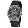 Skagen Mens SK581XLSLM Black Label Black Dial Watch: Skagen: Watches. Tang clasp. The History of Skagen Designs In 1987, Henrik and Charlotte Jorst came to the United States from their native Denmark to follow a dream: that of owning and running their own business. Skagen Designs was founded by these two natives of Copenhagen on the principle that beautifully designed, high-quality objects can be created at reasonable prices. The Skagen Collection of watches reflects the Jorsts' creative Danish spirit with clean, elegant designs, skillful craftsmanship and technical perfection. When you purchase a piece from the Skagen Collection, you become part of an international community of Skagen owners who believe in a philosophy of design and manufacturing excellence. Skagen Trend Spotting In the market place, time never stands still and so our innovation never sits idle. Our design team is on the pulse of current fashions, with regular visits to design centers of the world including Denmark, Switzerland,Italy, France, New York and Hong Kong. We are never content to follow established trends. We stay true to our classic design philosophy and interpret trends accordingly. We observe, listen and innovate - all to create lasting design pieces. The Result The production of such lasting design pieces often demands special processes and tooling. These are often a challenge to create; however, we are never satisfied with close enough. We continually push and fine-tune designs to stay true to our standards. We know what we want and are not satisfied until the design, material and workmanship are all just right. The result of such hard work and dedication speak for themselves in the jaw dropping enthusiasm and excitement created whenever anyone views our product line. Maintaining Your Skagen Watch Ensure that the crown is returned to the normal operating position before the watch comes in contact with water. Do not take your watch into a Hot Tub or Sauna. Under normal conditions, the seals in your Skagen watch will deteriorate and may need to be replaced every 2-3 years. Have your Skagen watch serviced by an official service center. All Skagen watches operate with standard batteries. When necessary, any jeweler can replace them for you. Different models are water resistant to varying degrees. Please refer to the back of your watch for the water resistant rating. How To Set The Time And Date Pull the crown out to the middle position. Rotate the crown to set date Pull the crown out to fully extended position and rotate crown to set desired time. Push the crown back to its normal position. The date and time are now set. Cleaning Your Skagen Watch Skagen suggests the following solutions for cleaning metal and crystal surfaces: 3:1 solution of ammonia based window cleaner to water 4:1 solution of rubbing alcohol to water. Do not use soap products. These suggested solutions will evaporate cleanly from metal and glass surfaces. Soap will leave residue behind when dry. To clean the case and crystal: Moisten a soft cloth with one of the above solutions. Gently wipe the case and crystal clean. Be careful not to put too much stress on the crystal as you clean. *NEVER immerse or soak the case/crystal portion of the watch, regardless of water resistance rating. Moisture could seep past the seals over time. To clean the band or strap: Skagen soft mesh bands are easily adjustable. Simply inser[5253] Stainless steel case and black leather bracelet. Fixed stainless steel bezel. grey sunray dial with silver-tone hands and stick markers. Date displays at the 4 o'clock position. Chronograph - three sub-dials displaying: day of the week, 30 minutes and 60 seconds. Quartz movement. Scratch resistant mineral crystal. Case width: 36 mm. Case thickness: 11 mm. Water resistant at 30 meters / 100 feet.
