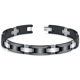 Sophisticated Tungsten and Ceramic Link Bracelet for Men: Peora: Jewelry. This beautiful bracelet measures 8.25 inches in Length and 3/8 inches in Width. Our most popular Men?s Accessory this bracelet is guaranteed to bring you compliments and stare. This sleek bracelet features watch style links in a stylish pattern. The aerodynamic Black Ceramic links are adjoined with cross shape Tungsten links. Completely scratch-resistant and hypoallergenic, this finely crafted piece includes a Gift Box and makes a perfect gift for Father?s Day, Graduation or just about any Special Occasion.