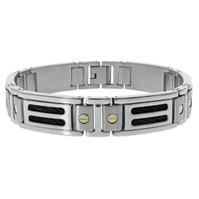Mens Stainless Steel Black Cable Bracelet with 10k Yellow Gold Screws Accent, 8.25: Jewelry. A stylish complement to casual or business attire, it has a length of 8 1/4 inches and closes with a foldover clasp. Gleaming stainless steel links are inset with black steel cable and 10 karat yellow gold screws in this tasteful modern bracelet.
