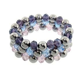 Stainless Steel and Glass Bead Stretch Bracelets, Set of 3: Jewelry. The Stretch Stainless Steel and Glass Bead Bracelets combine a pattern of round stainless steel beads and crystals in blue, purple and pink hues. Adorn your wrist with a unique combination of stainless steel and glass. Wear the pink and silver bangle to showcase your elegant side, the silver and blue with your favorite daytime look, and the black and silver to accent your edgy style.
