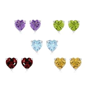 Sterling Silver Amethyst, Citrine, Blue Topaz, Garnet and Peridot Heart Stud Earrings, Set of Five: Jewelry. The dainty faceted hearts include purple amethyst, golden citrine, spring green peridot, deep orange-red garnet, and sky blue topaz. Own sparkling heart-shaped studs in a rainbow of colors with this set of five popular gemstone earrings.