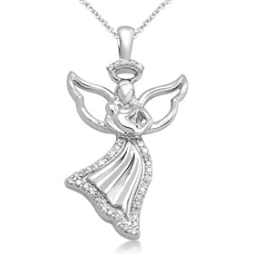 Sterling Silver Diamond Angel Pendant Necklace (1/7 cttw, I-J Color, I2-I3 Clarity), 18: Jewelry. The Sterling Silver Diamond Angel Pendant Necklace reveals a romantic pendant design of an angel in a swirling 925 sterling silver gown with wings stretched wide and a scroll in hand. Angel pendants are a popular accessory choice, often worn as the representation of a guardian angel.